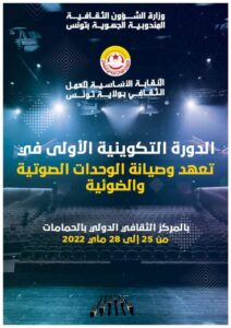 بالتعاون مع النقابة الأساسية للعمل الثقافي بولاية تونس تنظم المندوبية الجهوية بولاية تونس دورة تكوينية حول « تقنيات استعمال التجهيزات الصوتية والضوئية والتوضيب الركحي » من 25 الى 28 ماي 2022 بالمركز الثقافي الدولي بالحمامات.